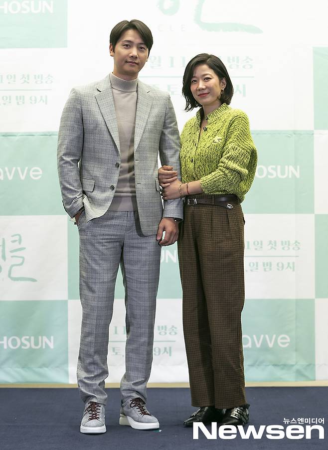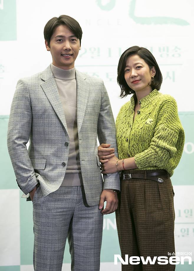 배우 이상우, 전혜진이 12월 9일 오후 온라인으로 진행된 TV조선 새 토일 미니시리즈 '엉클' 제작발표회에서 포즈를 취하고 있다.