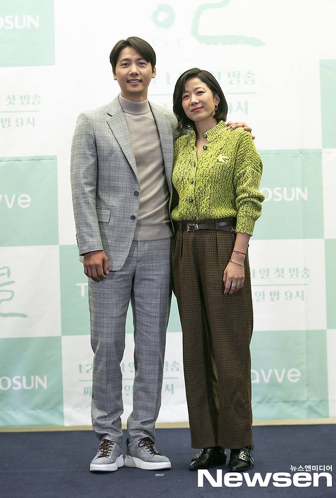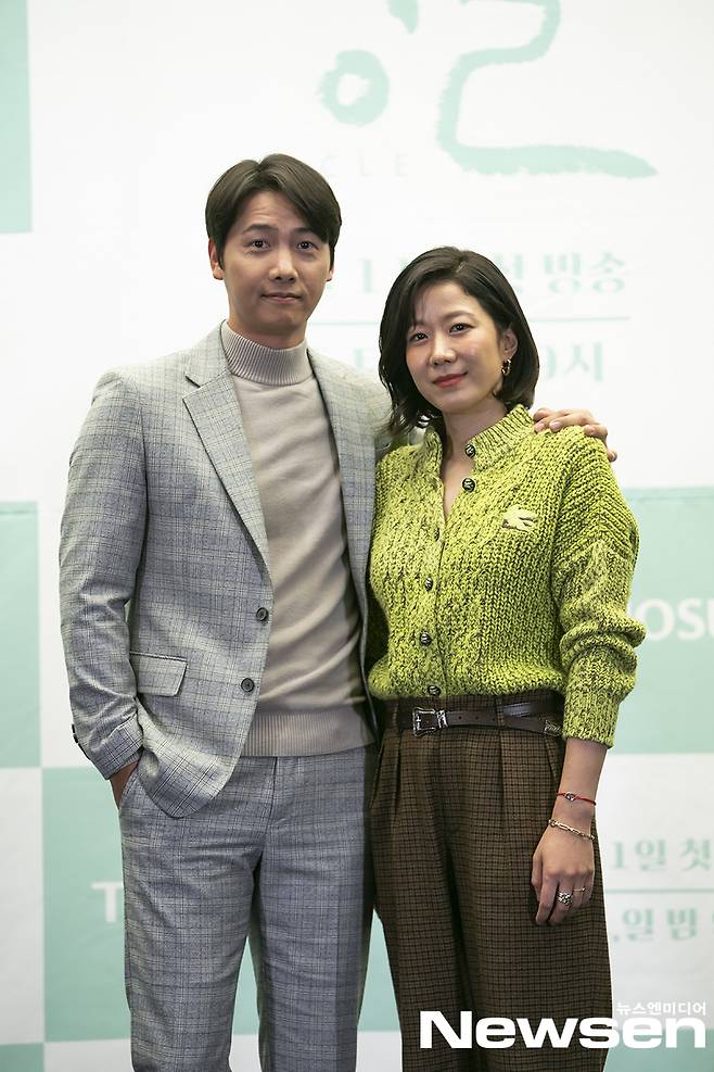 배우 이상우, 전혜진이 12월 9일 오후 온라인으로 진행된 TV조선 새 토일 미니시리즈 '엉클' 제작발표회에서 포즈를 취하고 있다.