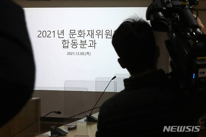 [서울=뉴시스] 백동현 기자 = 9일 오후 서울 종로구 국립고궁박물관에서 김포 장릉 공동주택단지 조성 관련 제3차 궁능-세계유산 합동분과위원회 회의가 비공개로 개최되었다. 사진은 이날 개최 전 회의장 모습. 2021.12.09. livertrent@newsis.com