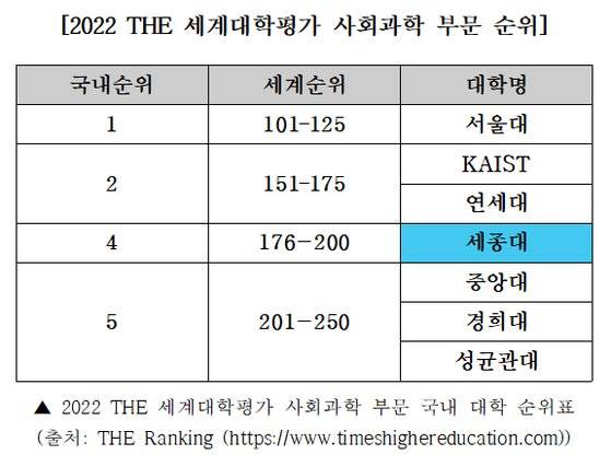 세종대, '2022 THE 세계대학 학문분야평가' 사회과학 부문 국내 4위