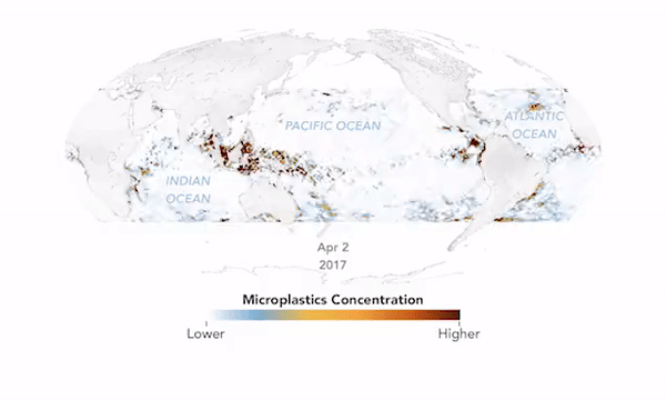 미국 항공우주국(NASA)은 지난 4일(현지시간) 트위터에 바다에 유입된 플라스틱 쓰레기가 해류를 타고 움직이는 모습을 보여주는 세계 지도를 공개했다. 지도는 미국 미시간대 연구진이 개발한 플라스틱의 부피 정량화 관측 기술 덕분에 애니메이션 형태로 제작될 수 있었다. 특히 2017년 4월부터 2018년 9월까지 1년여 동안 전 세계 바다에 떠 있던 플라스틱의 흐름과 농도를 자세히 보여준다.