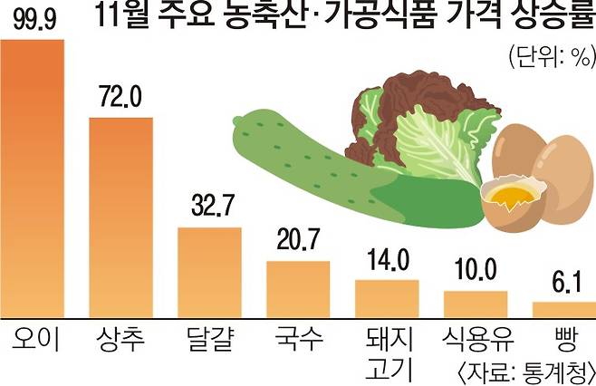 국내 작황 부진까지 겹치면서 주요 신선식품 가격도 안심하기 어렵다. 통계청이 발표한 자료에 따르면 지난달 오이(99.9%), 상추(72%), 돼지고기(14%) 품목 등의 가격이 크게 뛰었다.