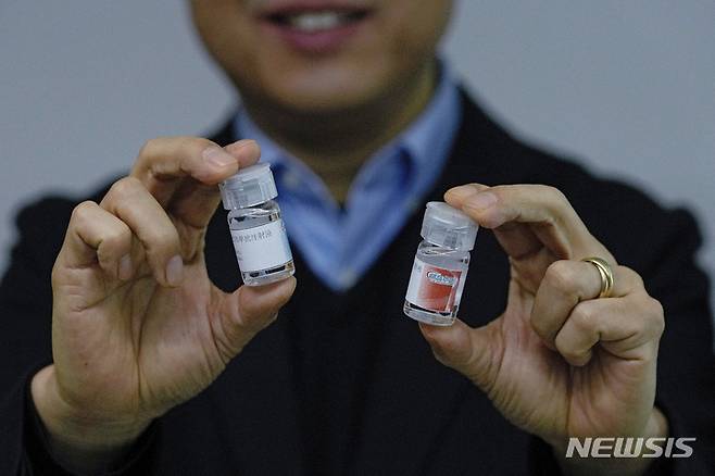 [베이징=AP/뉴시스] 장린치 칭화대 의대 교수가 9일 중국 베이징의 칭화대에서 기자회견을 하면서 선전 제3인민병원, 브리 바이오사이언시스와 공동으로 개발한 코로나19 항체로 만든 치료제를 소개하고 있다. 2021.12.09.
