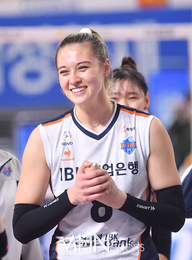 IBK기업은행 라셈이 팀원들과 인사를 나누고 있다.