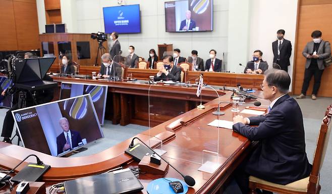 [서울=뉴시스] 전진환 기자 = 문재인 대통령이 9일 청와대 여민관 영상회의실에서 민주주의 화상 정상회의에 참석해 조 바이든 미국 대통령의 개회사를 듣고 있다. 2021.12.09. amin2@newsis.com