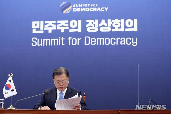 [서울=뉴시스] 전진환 기자 = 문재인 대통령이 9일 청와대 여민관 영상회의실에서 민주주의 화상 정상회의에 참석해 자료를 살펴보고 있다. 2021.12.09. amin2@newsis.com