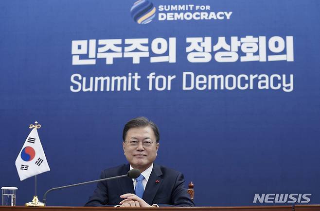 [서울=뉴시스] 전진환 기자 = 문재인 대통령이 9일 청와대 여민관 영상회의실에서 민주주의 화상 정상회의에 참석해 조 바이든 미국 대통령의 개회사를 듣고 있다. 2021.12.09. amin2@newsis.com