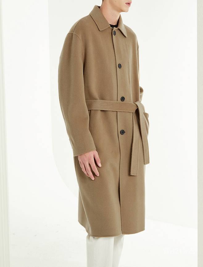 자연스럽게 떨어지는 어깨 라인과 오버핏으로 편안함을 강조했으며 같은 소재의 허리 벨트 구성으로 묶는 스타일에 따라 다양한 실루엣 연출이 가능하다.