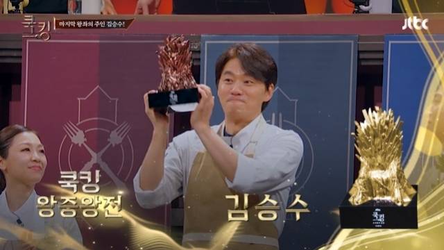 이후 왕중왕전 우승은 14개의 표 중 7표를 받은 김승수가 차지했다. 김승수는 "뜻밖이라는 말이 지금 생각난다. 너무 쟁쟁하신 분들이 계셨는데 한 가지, 반백이 넘은 나이에 음식을 조금은 잘하고 싶다는 마음으로 뛰어들었고 오랜만에 열심히 하고 싶다는 열정이 생긴게 굉장히 큰 경험이고 기쁨이다. 그것만으로 감사한데 이런 영광 주셔서 감사하다는 말밖에 드릴 말씀이 없다"고 소감을 말했다. 김승수는 이날 받은 트로피를 가장 잘보이는 곳에 두고 항상 보고 싶다며 만족을 드러냈다. (사진=JTBC '쿡킹 : 요리왕의 탄생' 캡처)
