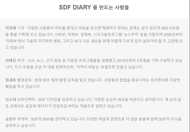 | * 이 기사는 매주 수요일 아침 발송되는 뉴스레터, 'SDF 다이어리'에 소개됐습니다. SDF 다이어리는 SBS D포럼을 준비하는 SBS 보도본부 미래팀원들이 작성합니다. 우리 사회가 관심 가져야 할 화두를 앞서 들여다 보고, 의미 있는 새로운 관점이나 시도를 전합니다. ▶ SDF 다이어리 구독하러 가기 [ https://page.stibee.com/subscriptions/67025 ] |