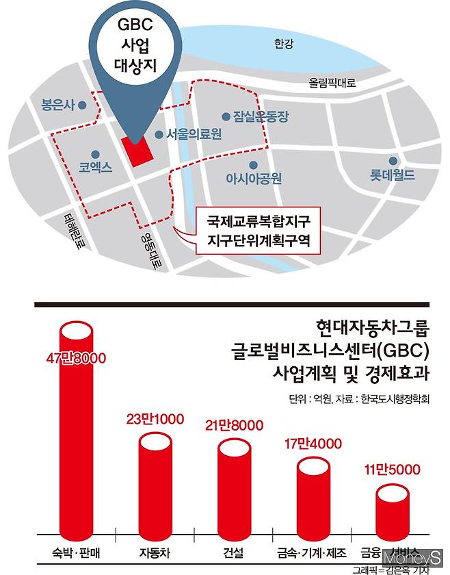 GBC는 지난해 5월 착공허가를 받고 기초공사를 시작했지만 실제 착공은 진행하지 못하고 있다. 쟁점은 층수 변경을 골자로 한 설계변경이다. 만약 내년 초 본착공을 하더라도 사업계획 상 완료 시점인 2026년 준공은 빠듯하다. 현대차그룹의 당초 설계안이었던 105층 마천루는 준공 후 20년 동안 약 253조원의 경제효과를 발생시킬 것으로 추정됐다. 현대차그룹의 GBC 개발계획과 한국도시행정학회의 사업 타당성 조사 결과 GBC의 예상 고용 효과는 공사 과정 7만9000명, 준공 후 약 113만7000명이다.
