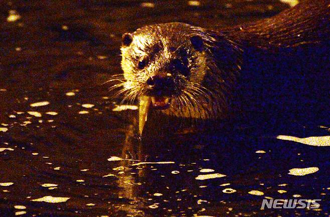 [전주=뉴시스] 김얼 기자 = 쌀쌀한 겨울 날씨가 이어지고 있는 13일 새벽 전북 전주시 덕진구 우아동 아중교 일대의 아중천에서 천연기념물인 수달이 먹이활동을 하기 위해 분주하게 움직이고 있다. 2021.12.13. pmkeul@newsis.com
