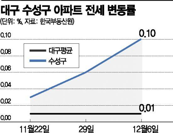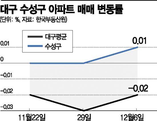 최근 대구 집값이 하향세에 접어들었지만 수성구는 대학수학능력시험(수능) 이후 매매·전세가격 모두 오름폭을 키우며 나홀로 상승세를 보이고 있어 주목된다.