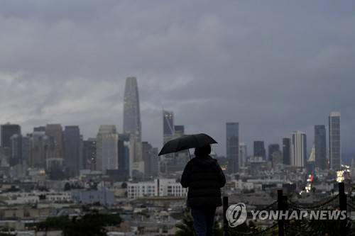 A pedestrian carries an umbrella while looking toward the skyline from Dolores Park in San Francisco, Monday, Dec. 13, 2021. A major winter storm hitting Northern California is expected to intensify and bring travel headaches and a threat of localized flooding after an abnormally warm fall in the U.S. West. (AP Photo/Jeff Chiu)
