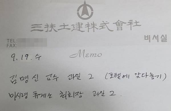| ▲ 조남욱 전 삼부토건 회장 관련자료에는 윤석열 전 검찰총장의 장모와 부인이 등장한다. 회장 비서실에서 작성한 메모에는 '미시령휴게소'와 김명신 교수'로 표기돼 있다. |