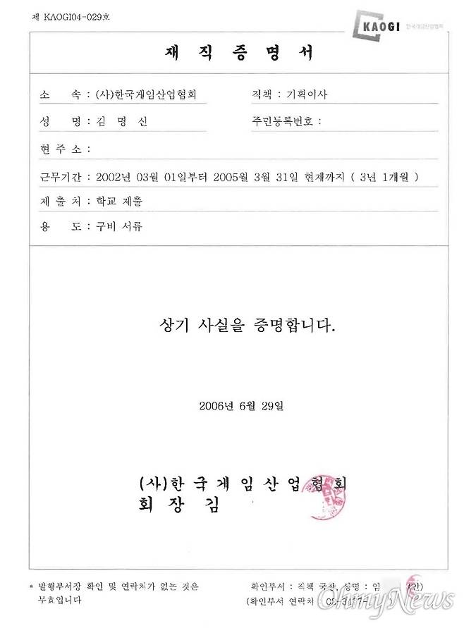 재직증명서의 일련번호 또한 김씨가 낸 4개의 다른 경력증명서와 달랐다. 재직증명서 일련번호는 'KAOGI04'로 시작하고 있다. 여기서 앞 영문자는 (사)한국게임산업협회를 가리킨다. 문제는 '04'인데, 기관과 기업체 증명서의 경우 통상적으로 이 일련번호는 발급 연도를 따른다. 그런데 2006년에 발급한 증명서가 '2006' 또는 '06'이 아니라 '04'로 시작하는 것이다.