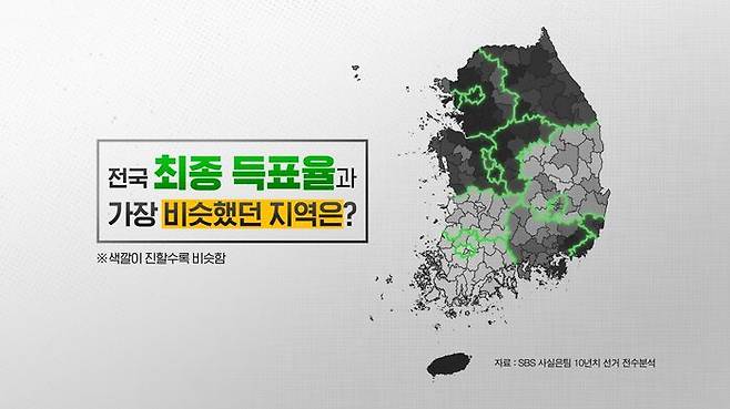 진할수록 전국 득표율과 유사한 지역으로 보시면 됩니다.