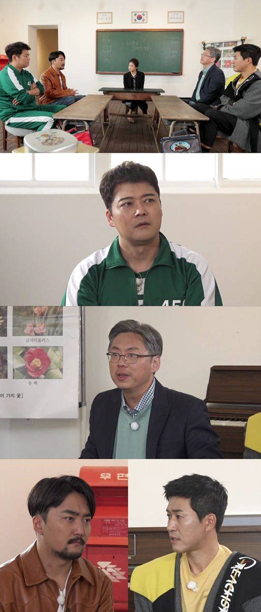 '선을 넘는 녀석들: 마스터-X'에서 전현무, 김종민, 유병재가 학교 폭력, 집단 따돌림 문제에 심각해진다.