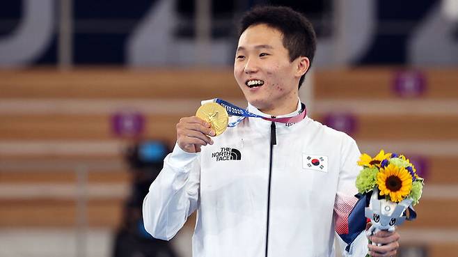 신재환은 도쿄올림픽 도마에서 금메달을 목에 걸었습니다.