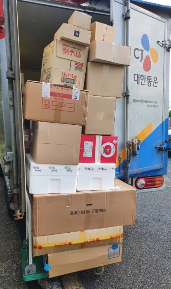 | ▲ 택배 탑차에서 구역 내 배달할 박스들을 끌차에 내려 놓고 배달 준비를 한다. |