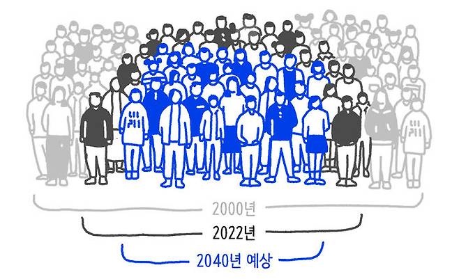 인구가 줄어드는 만큼 당연히 수능 응시생의 수도 줄어들었어요. 1994학년도부터 시작된 수능은 2000년도가 지원자 89만 6,122명으로 가장 많았고 이후에는 감소하고 있습니다. 위에 있는 단체 사진에서 꽉 채운 인원이 2000년도에 지원한 학생들의 규모입니다. 하지만 올해 2022학년도 수능의 지원자수는 50만 9,821명. 앞으로 2030년에는 47만 명, 2040년에는 26만 명으로 감소할 것으로 예측되고 있어요. 결국 2040년에는 파란색 친구들만 남는 상황이죠.