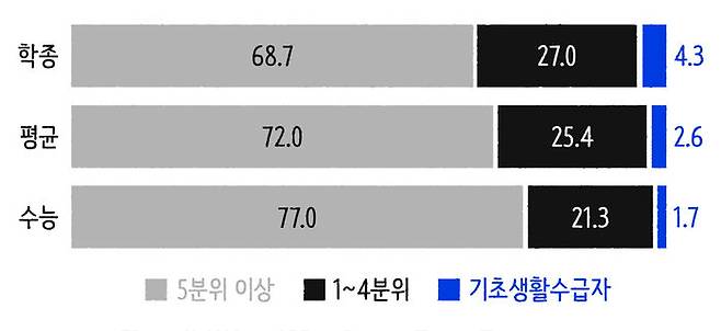 정말 수능이 정말 공정한 걸까요? 사실 학생부종합전형은 수능보다 고소득층의 비율이 더 낮고, 대도시 비율도 더 낮게 나옵니다. 형평성 측면에서 학종이 다른 전형보다 낫다고 할 수 있을겁니다. 위의 그래프는 전국 54개 대학의 15~16년 입학생 24만 2,790명을 전수 조사해 전형별로 신입생의 소득분위를 나타낸 그래프입니다. 확실히 학생부 종합전형의 저소득층 비율이 높은 걸 확인할 수 있어요.