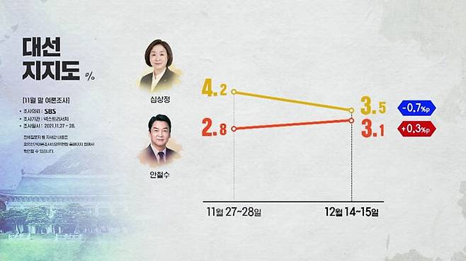 심 후보는 0.7%포인트 하락, 안 후보는 0.3%포인트 상승했습니다.