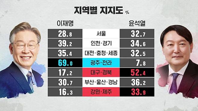 지역별로는 이 후보는 호남에서, 윤 후보는 TK와 강원·제주에서 더 높은 지지율을 보였습니다.