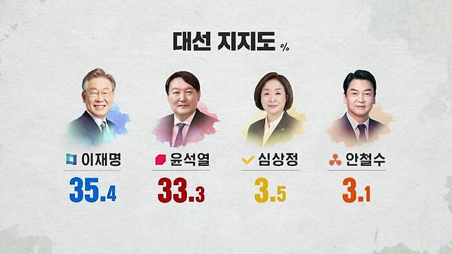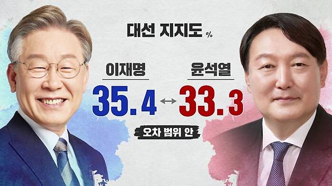 민주당 이재명 35.4%, 국민의힘 윤석열 후보 33.3%로, 격차는 2.1%포인트, 오차 범위 안에 있습니다.