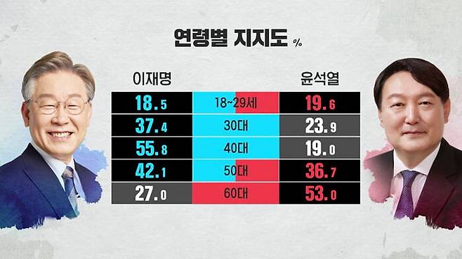 이재명, 윤석열 후보의 지지층을 연령대별로 따로 보면, 이 후보는 30대, 40대에서, 윤 후보는 60대 이상에서, 각각 더 많은 지지를 받았고, 50대와 20대 이하에서는 팽팽했습니다.