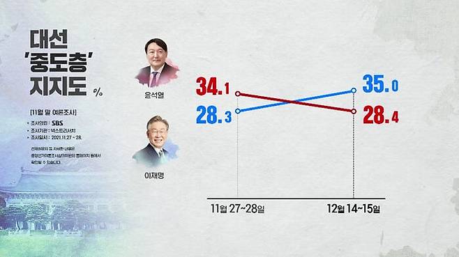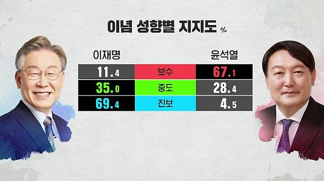 이념 성향별로는 보수층에서는 윤 후보, 진보층에서는 이 후보 지지가 압도적인데, 캐스팅보트로 평가받는 중도층에서 변동이 나타났습니다.