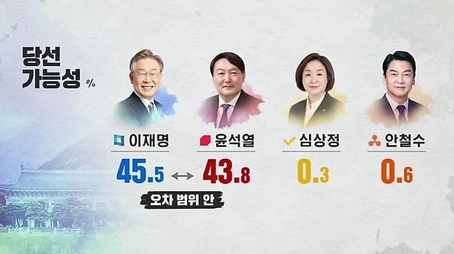 먼저 대선 후보 지지도에서는 민주당 이재명 후보, 또 국민의힘 윤석열 후보가 오차 범위 안에서 접전인 것으로 나타났습니다.