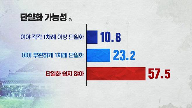 후보 단일화 가능성에 대해서는, 후보 간 입장의 차이로 단일화가 쉽지 않을 것 같다가 57.5%로 가장 높게 나타났습니다.