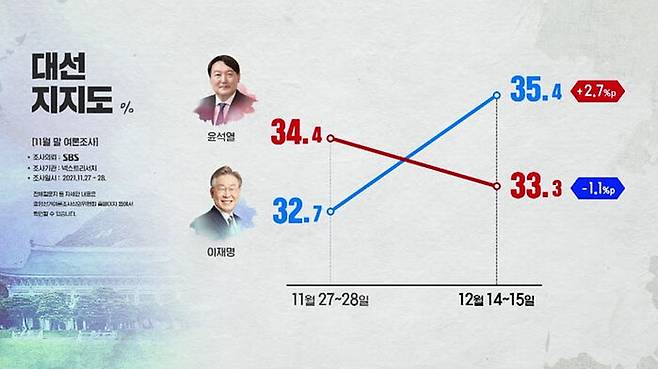 지난달 말 SBS 여론조사와 비교해보니, 이 후보는 2.7%포인트 올랐고, 윤 후보는 1.1%포인트 내렸습니다.
