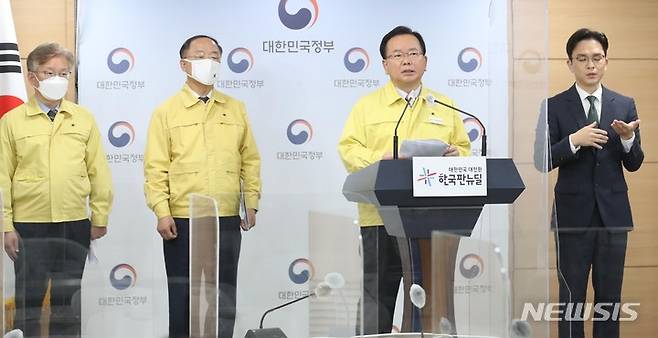 [서울=뉴시스] 김명원 기자 = 김부겸 국무총리가 17일 오전 서울 종로구 정부서울청사에서 방역강화 조치 시행에 따른 소상공인·자영업자 지원방안 브리핑을 하고 있다. (공동취재사진) 2021.12.17. photo@newsis.com