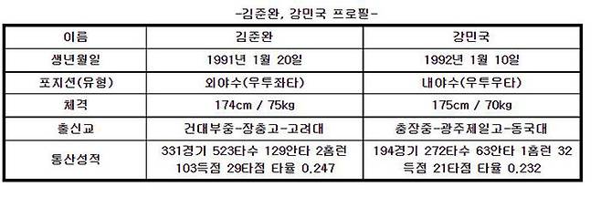 고형욱 키움 단장은 "김준완은 외야 전 포지션을 뛸 수 있는 선수로 빠른 주력과 정확한 타격이 장점이며, 강민국은 신인 드래프트에서 1차 지명을 받을 만큼 재능을 인정받은 선수"라며 "두 선수 모두 공수에서 좋은 활약을 펼쳐줄 것으로 기대한다"고 말했습니다.