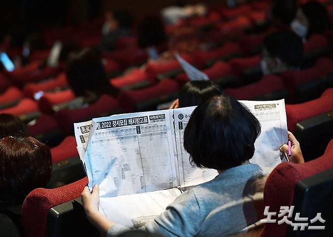 12일 오후 서울 종로구 성균관대학교 600주년 기념관에서 열린 종로학원 2022 대입 정시 합격점수 예측 발표, 특별전략 설명회에서 수험생 및 학부모들이 정시 지원 배치 참고표를 살펴보고 있다. 이한형 기자