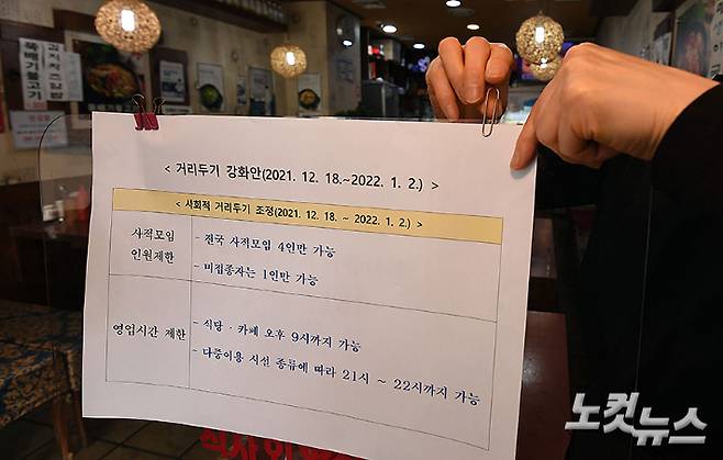 정부가 사적 모임 허용 인용을 전국에 걸쳐 4인으로 축소하고 식당과 카페의 이용 시간은 밤 9시까지로 제한하는 등의 강력한 사회적 거리두기 강화조치를 발표한 16일 오후 서울 양천구 한 식당 관계자가 안내문을 부착하고 있다. 오는 18일부터 내년 1월 2일까지 16일간 적용되는 이번 조치는 식당·카페의 경우, 접종완료자로만 4인까지 이용이 가능하며 미접종자는 혼자서 이용하거나 포장·배달만 허용된다. 황진환 기자