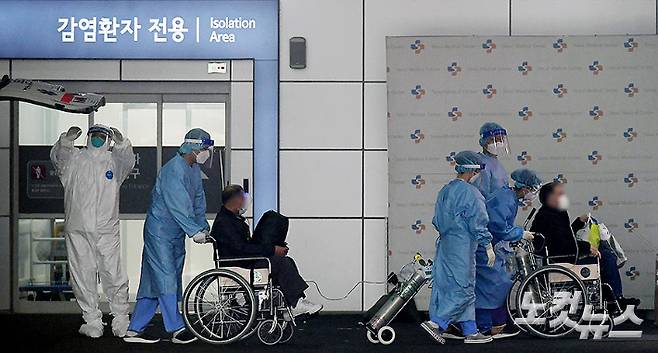 코로나19 신규 확진자가 7천850명, 위중증 환자가 964명 모두 역대 최다로 집계된 15일 오전 서울 중랑구 서울의료원에서 코로나19 환자가 입원을 위해 이동하고 있다. 위중증 환자는 17일까지 나흘 연속 900명대를 이어갔다. 이한형 기자