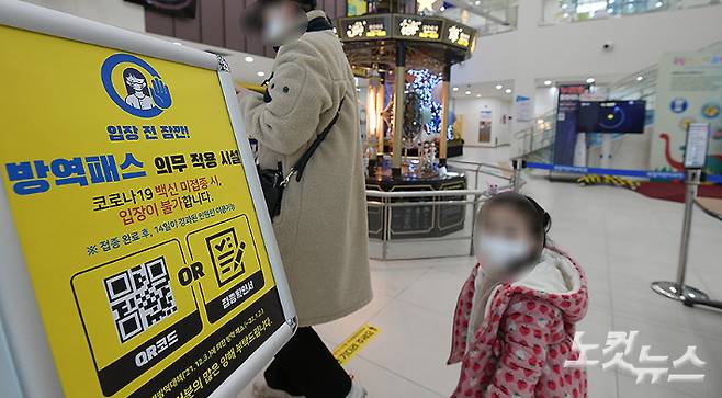 코로나19 방역패스(백신 예방접종 증명·음성확인서) 의무화 시행 둘째날인 14일 서울 종로구 국립어린이과학관에 방역패스 시행 안내문이 놓여 있다. 이한형 기자