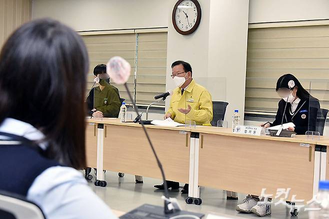 김부겸 국무총리가 15일 오전 서울 성동광진교육지원청에서 열린 '코로나19 백신 청소년 접종관련 학생, 학부모 간담회'에서 모두발언을 하고 있다. 학생과 학부모 10명을 직접 만나 청소년 백신 접종에 대한 여러 의견을 나눈 김 총리는 "앞으로 청소년의 백신 접종에 대한 오해와 걱정이 생기지 않도록 충분히 설명하는 한편, 이상반응에 대해서도 보다 강화된 대응을 통해 안심하고 접종할 수 있도록 조치하겠다" 고 말했다. 박종민 기자