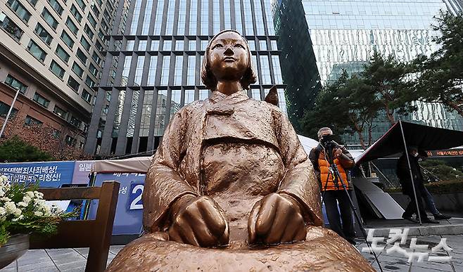 15일 서울 종로구 옛 일본대사관 앞에 평화의 소녀상이 자리를 지키고 있다. '평화의 소녀상'은 지난 14일 건립 10주년을 맞았다. 정의기억연대에 따르면 지난 10년 동안 세워진 소녀상은 국내 144개, 해외 32개다. 박종민 기자