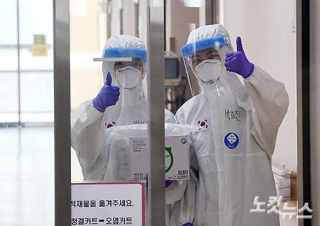 17일 경기 성남시 국군수도병원 감염병동에서 방역복을 입은 의료진이 엄지손가락을 들어보이고 있다. 박종민 기자