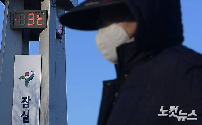 아침 기온이 영하권으로 뚝 떨어진 13일 오전 서울 송파구 잠실 한강공원 온도탑이 -3도를 표시하고 있다. 이한형 기자