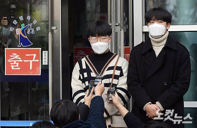 15일 서울행정법원 앞에서 2022학년도 수능 생명과학Ⅱ 20번 문항 정답 취소 행정소송을 제기한 응시자들이 취재진의 질문에 답하고 있다. 올해 대학수학능력시험에서 출제 오류 논란에 휩싸였던 과학탐구 영역 생명과학Ⅱ 20번 문항에 대해 법원이 정답 결정을 취소하는 판결을 내렸다. 서울행정법원 행정6부는 수능 수험생 92명이 '과탐 생명과학Ⅱ 20번 문항의 정답 결정을 취소해달라'며 한국교육과정평가원(평가원)을 상대로 제기한 소송에서 원고 승소 판결했다. 이한형 기자