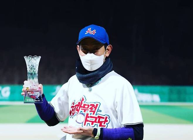 공개된 사진 속 김창열은 천하무적 야구단 유니폼을 입고 우승 트로피를 들고 있다.