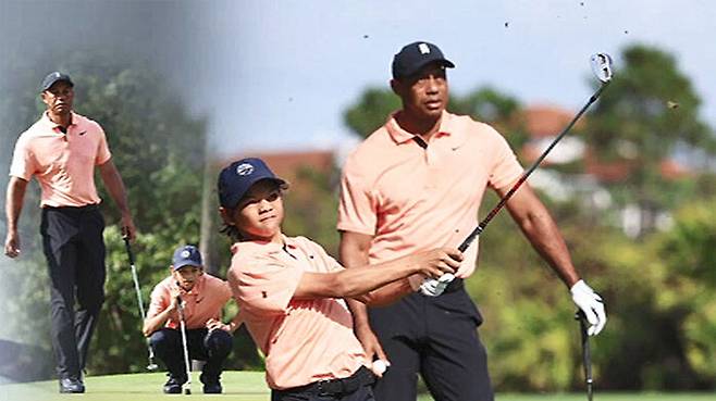 같은 색 옷을 맞춰 입고 나온 우즈 부자는 보기 없이 10언더파를 합작했습니다.