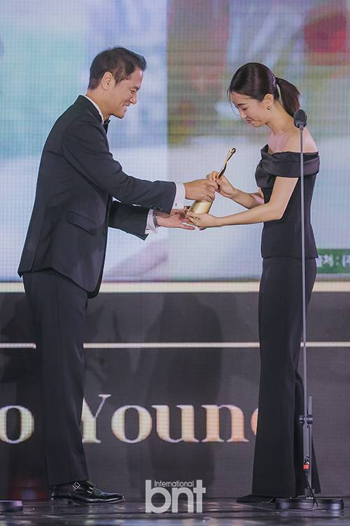 한국모델협회 임주완 회장이 '모델스타상'에 선정된 배우 이주영에게 트로피를 건네고 있다.