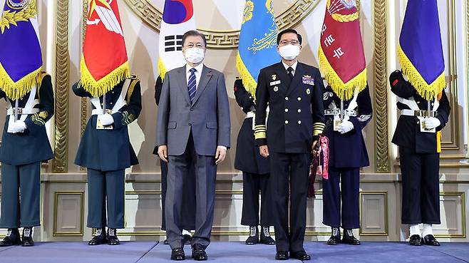 문 대통령 "정부 교체기, 안보 중요"..김정수 해군 총장 등 진급 · 보직 신고