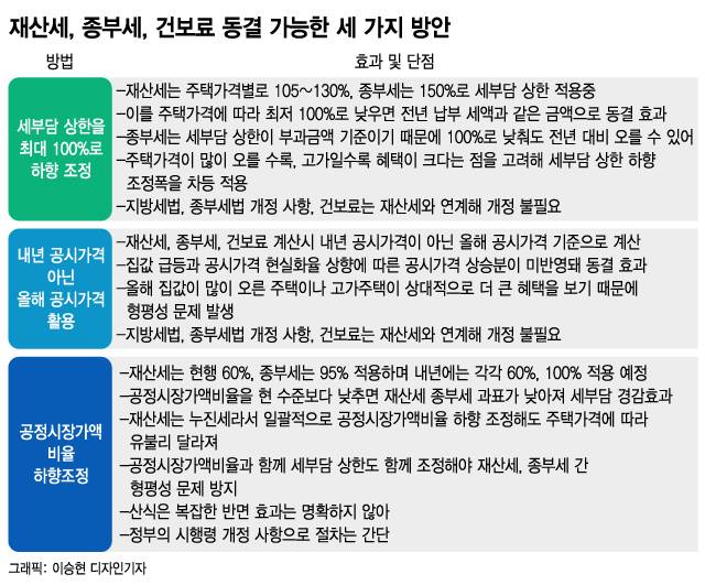 우병탁 신한은행 부동산투자자문센터 팀장은 "전년도 수준으로 동결하는 손쉬운 방법은 공정시장가액비율을 100% 수준으로 일괄적으로 낮추면 된다"면서도 "집값이 어느정도 상승했는지와 종부세까지 내고 있는 1주택자인지 여부에 따라 유불리가 갈릴 수 있기 때문에 다양한 경우의 수를 고려해 세부안을 만들어야 한다"고 말했다.